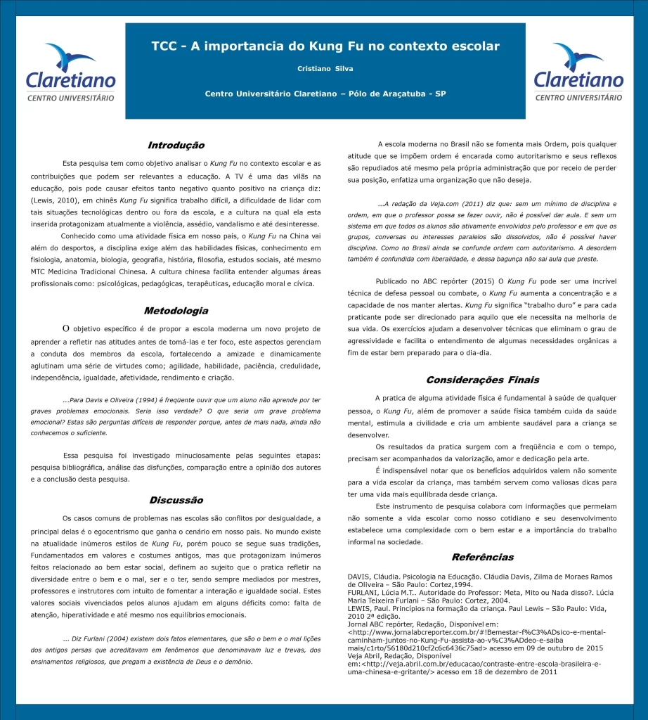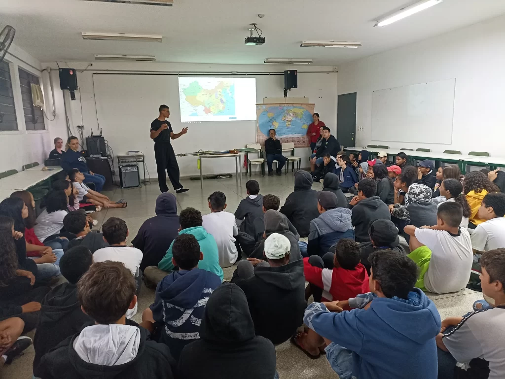 O kung fu no contexto escolar;é uma palestra voltada aos acadêmicos ou profissionais com nível superior, devido ao uso de termos científicos e analise de dados na qual comprova a abordagem do tema.